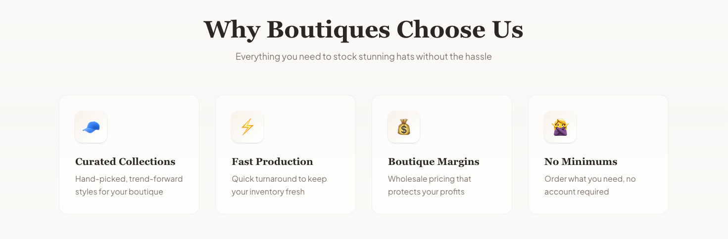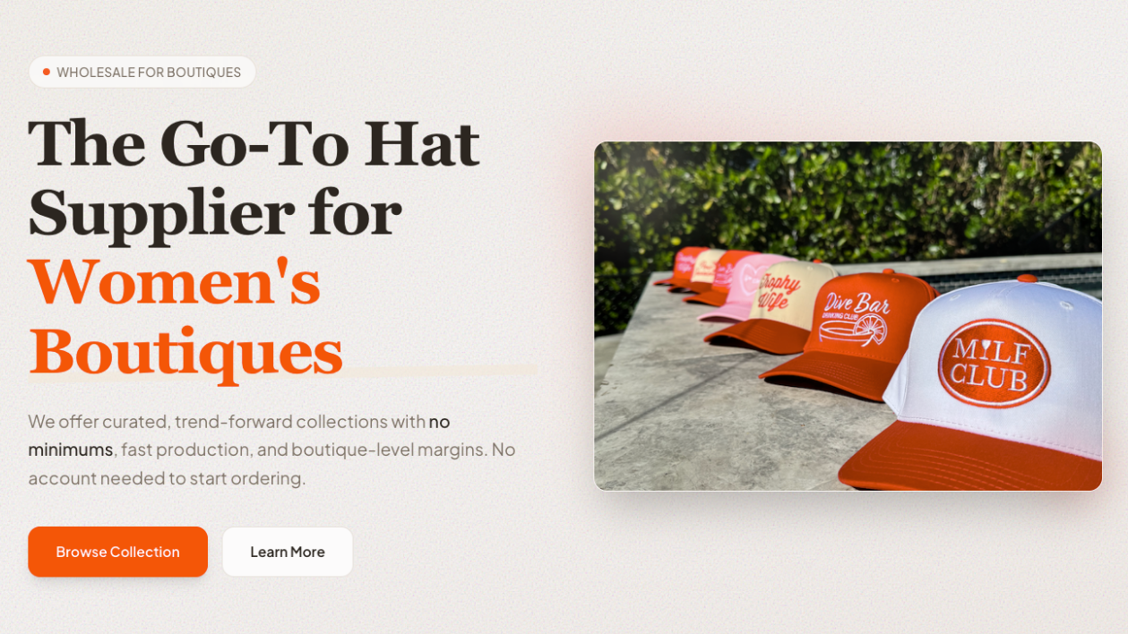 Yes. Every hat is designed with boutiques in mind — on-trend colors, clean embroidery, and quality fits your customers will actually buy.